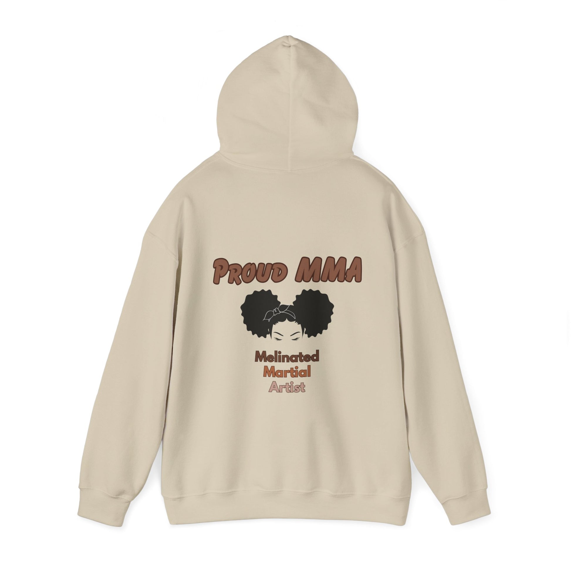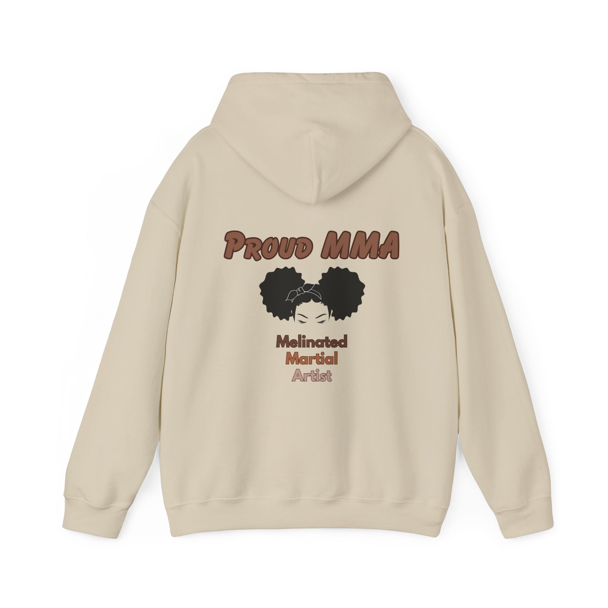 Be a PROUD Melanated Martial Artist in this hoodie designed to celebrate you and your dedication to the sport and your culture. This unisex heavy blend hooded sweatshirt is relaxation itself. Made with a thick blend of cotton and polyester, it feels plush, soft and warm, a perfect choice for any cold day. In the front, the spacious kangaroo pocket adds daily practicality while the hood's drawstring is the same color as the base sweater for extra style points.