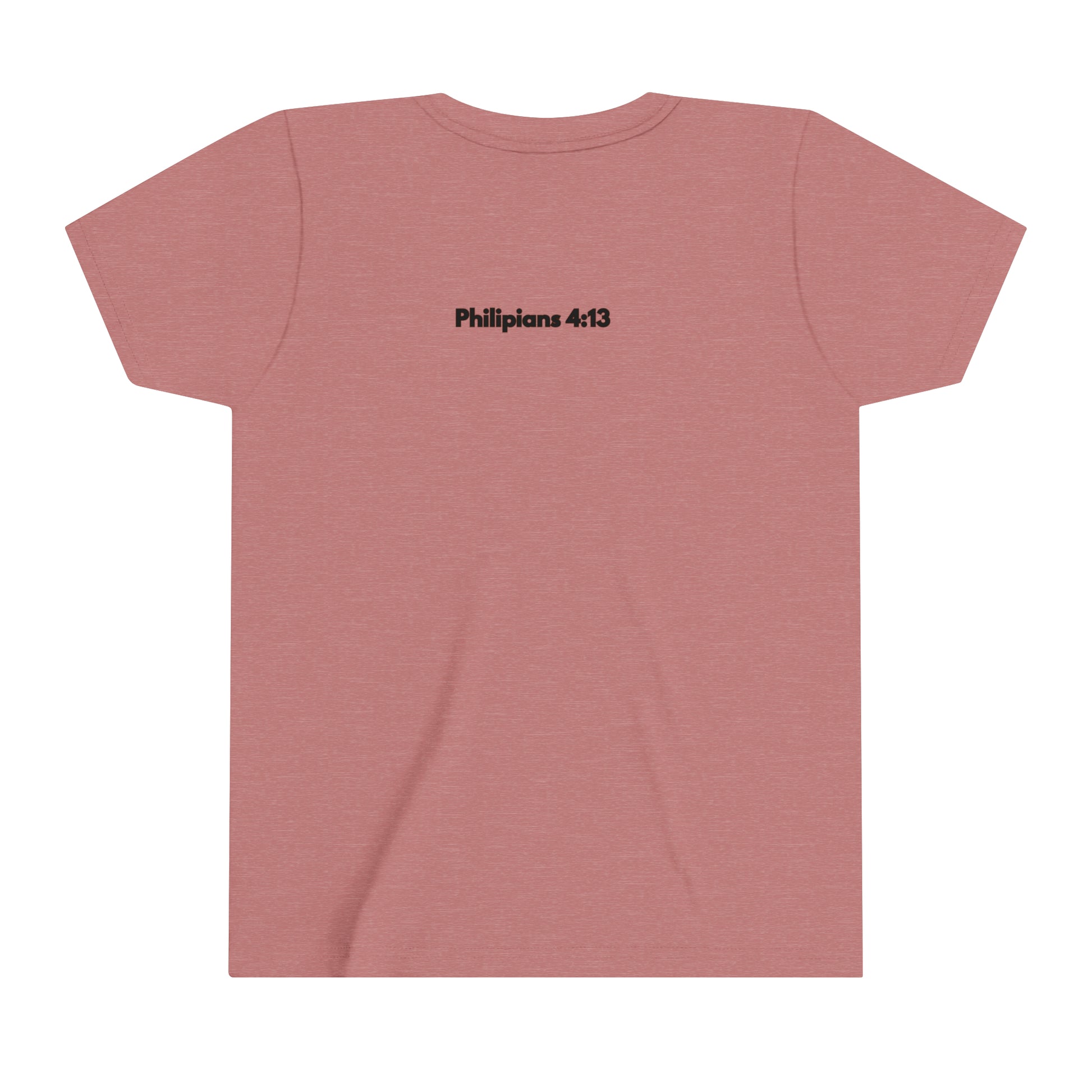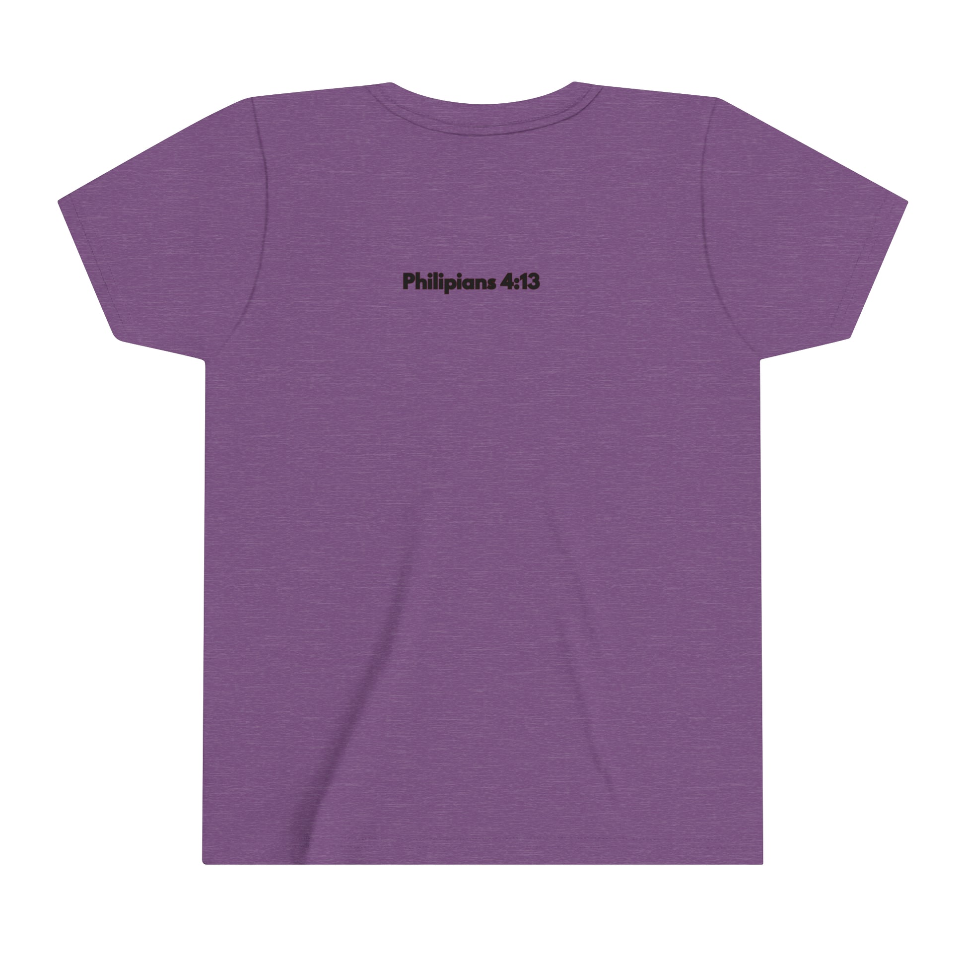 When training and competing there will be times when it gets hard. Remember who gives you your strength. You will love this custom youth short sleeve tee. This lightweight side-seamed shirt maximizes comfort all day long. The ring-spun cotton makes this kids short sleeve tee perfect for displaying custom artwork. Side seams keep the garment's shape. The shoulders have tape for longer fitting. The collar is extra elastic due to ribbed knitting.